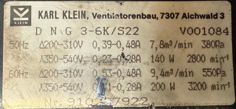 Karl Klein DNG 3-6K/S22 Ventilation Blower SKU: 12667BW Manufacturer: Karl KleinModel: DNG 3-6K/S22Type: Ventilation blowerCondition: UsedStock: 1 Enter Quantity