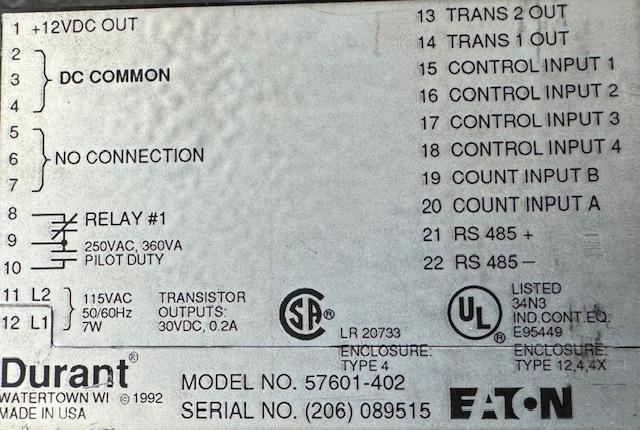 Eaton Durant 57601-402 Ambassador Series Totalizer, 8 digit, 115v, RS-485$0.00 SKU: 12638COU Manufacturer: DurantModel: 57601-402Serial Number: (206) 089515Type: counterPower: 115vCondition: UsedStock: 1 Enter Quantity