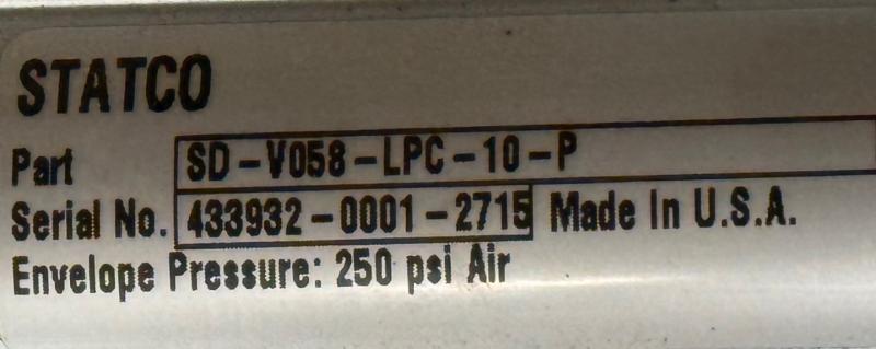 Statco SD-V058-LPC-10-P Pneumatic Cylinder SKU: 12691CYL Manufacturer: StatcoModel: SD-058-LPC-10-PSerial Number: 433932-0001-2715Type: Pneumatic CylinderBore: 2"Size: 22" longPressure: 250 PSI MaxCondition: UsedStock: 1 Enter Quantity
