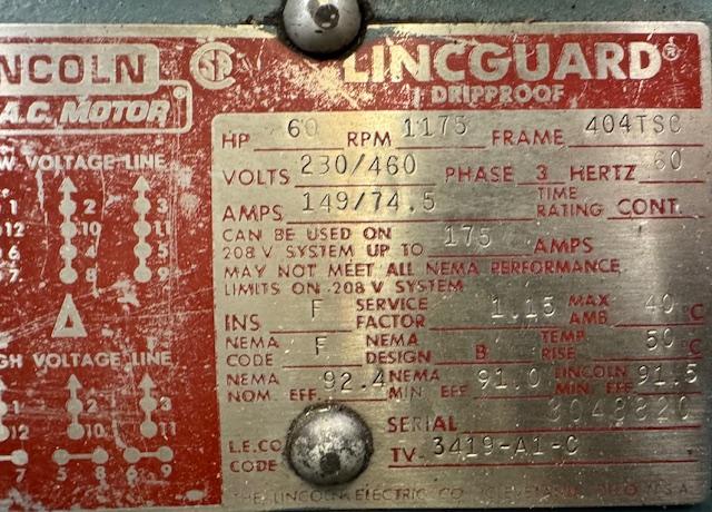 Lincoln 60hp motor$0.00 SKU: 12694MT Manufacturer: LincolnModel: TV# 3419-A1-CSerial Number: 3048820Type: 60HPPower: 230/460vCondition: UsedRPM: 1175Stock: 1 Enter Quantity
