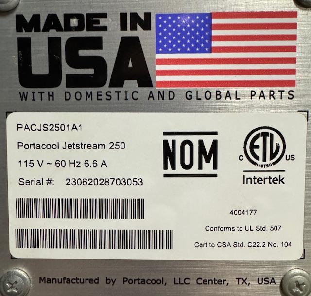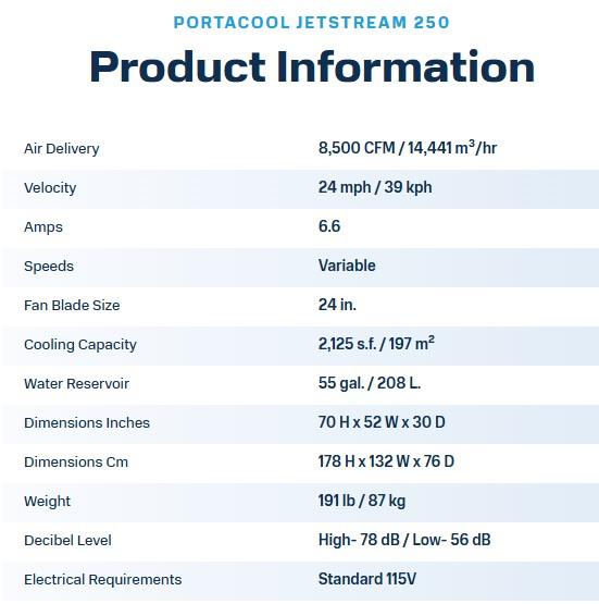 Portacool Jetstream 250 SKU: 12711AC Manufacturer: PortacoolModel: Jetstream 250 PACJS2501A1Serial Number: 23062028703053Type: 2,125 s.f/197 m(2)Power: 115vSize: 70H x 52W x 30DCooling: WaterCondition: UsedStock: 1 Enter Quantity